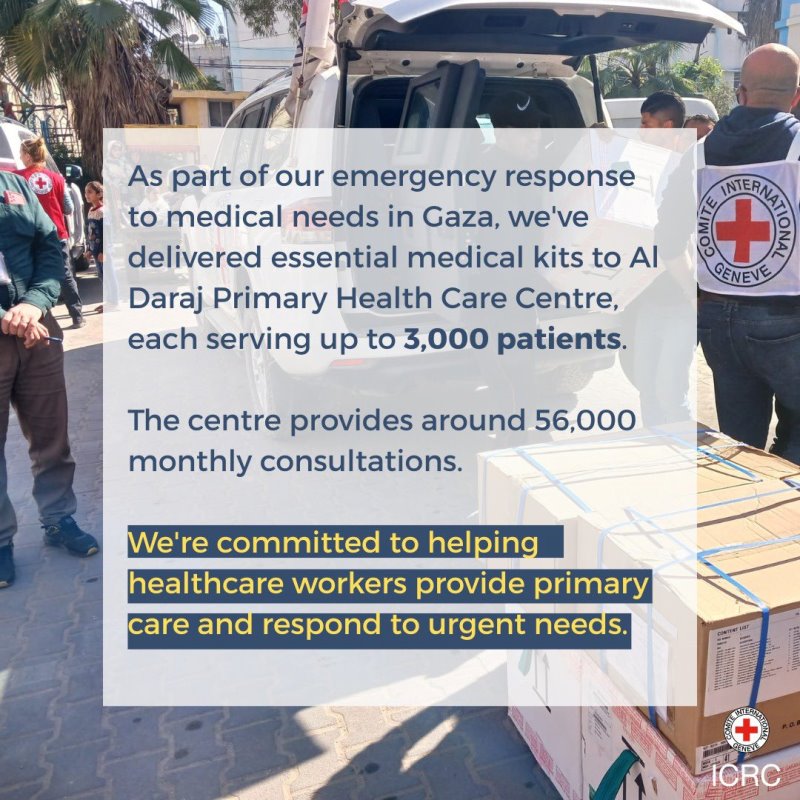 »01.05.2025-Izrael a území okupovaná: Gaza se potýká s nedostupností zdravotní péče, ať již z důvodu zničení většiny zdrav. zařízení, tak nedostatku léčiv a zdravotnického materiálu. Např. v těchto dnech dodal MVČK dodal MVČK soupravy zdrav. materiálu do Al Daraj centra primární péče, každá souprava pro ošetření 3.000 pacientů. Centrum poskytne měsíčně 56.000 ošetření.