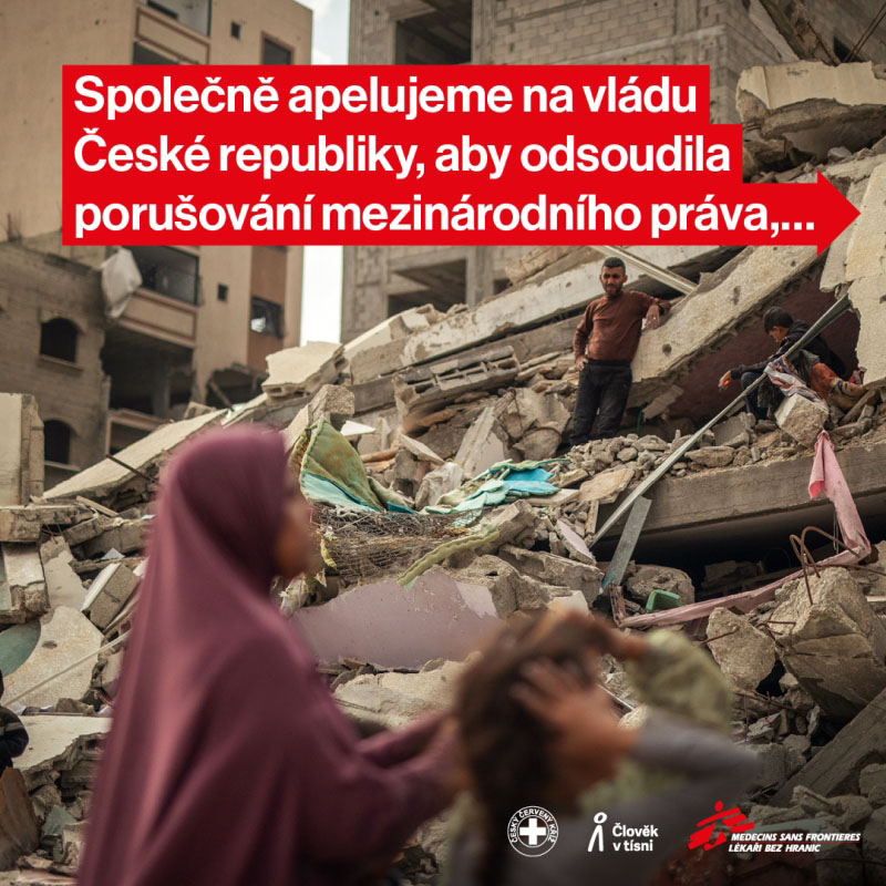 »05.08.2025-Izrael a území okupovaná: ČČK, Člověk v tísni a Lékaři bez hranic se obrátili na vládu ČR s naléhavou výzvou, aby vzhledem ke kritické situaci v Gaze jednoznačně odsoudila porušování mezinárodního humanitárního práva a využila všechny dostupné diplomatické nástroje k tlaku na dodržování mezinárodního humanitárního práva včetně obnovení nezávislé a nestranné humanitární pomoci v Gaze i propuštění rukojmí: [+++]