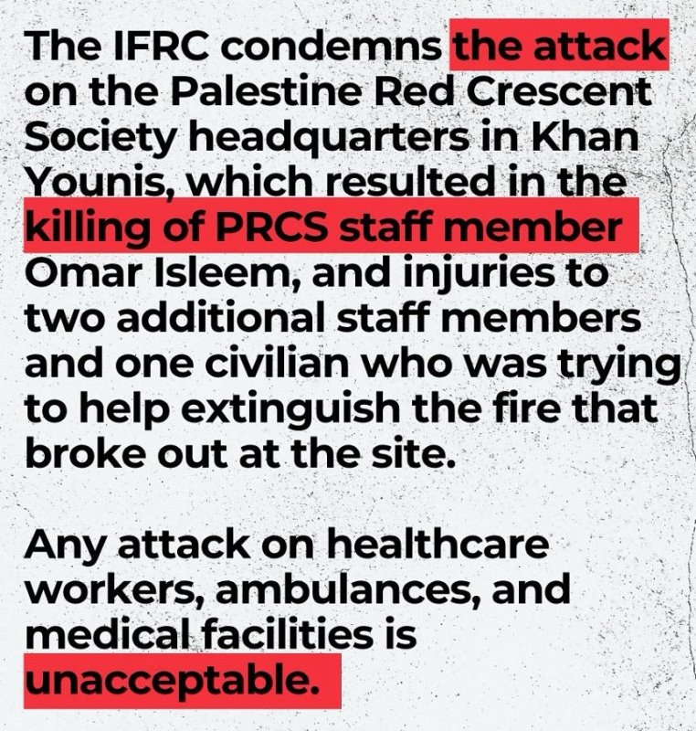 »17.04.2025-Izrael a území okupovaná: Výkonná rada MF ČK&ČP vydala stanovisko k útoku na palestinské zdravotníky z 23.03. Označila ho za nepřijatelné porušení mezinárodního humanitárního práva. Obětavě sloužili v první linii, přinášeli životně důležitou pomoc. Jejich smrt není jen osobní tragédií pro rodiny a kolegy - je to hluboká rána samotnému jádru naší humanitární mise a principům, které zastáváme. Stanovisko podporuje i ČČK. Více: [+++]