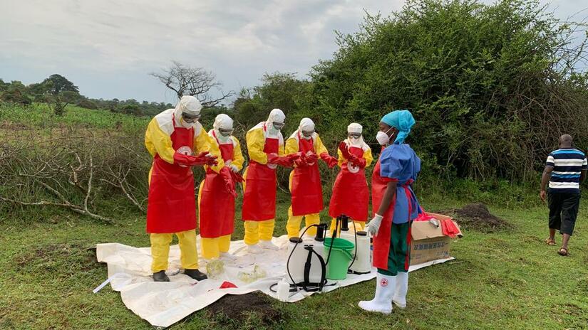 »02.11.2022-Uganda: V zemi aktuálně propukla ebola. první případ hlášen 20.09.2022 a Ugandský ČK okamžitě aktivoval své týmy pro prevenci a boj s touto nemocí. Na snímku např. tým pro vedení důstojných a bezpečných pohřbů osob zemřelých na ebolu (tradiční pohřební rituály v komunitách jsou jednou z nejčastějších forem přenosu nákazy). V rámci prevence navštěvují komunity a vysvětlují způsob šíření a ochrany před nákazou včetně nutnosti včasné detekce nových případů. Předchozí vzplanutí nákazy bylo v roce 2020 u hranic s DR Kongo.