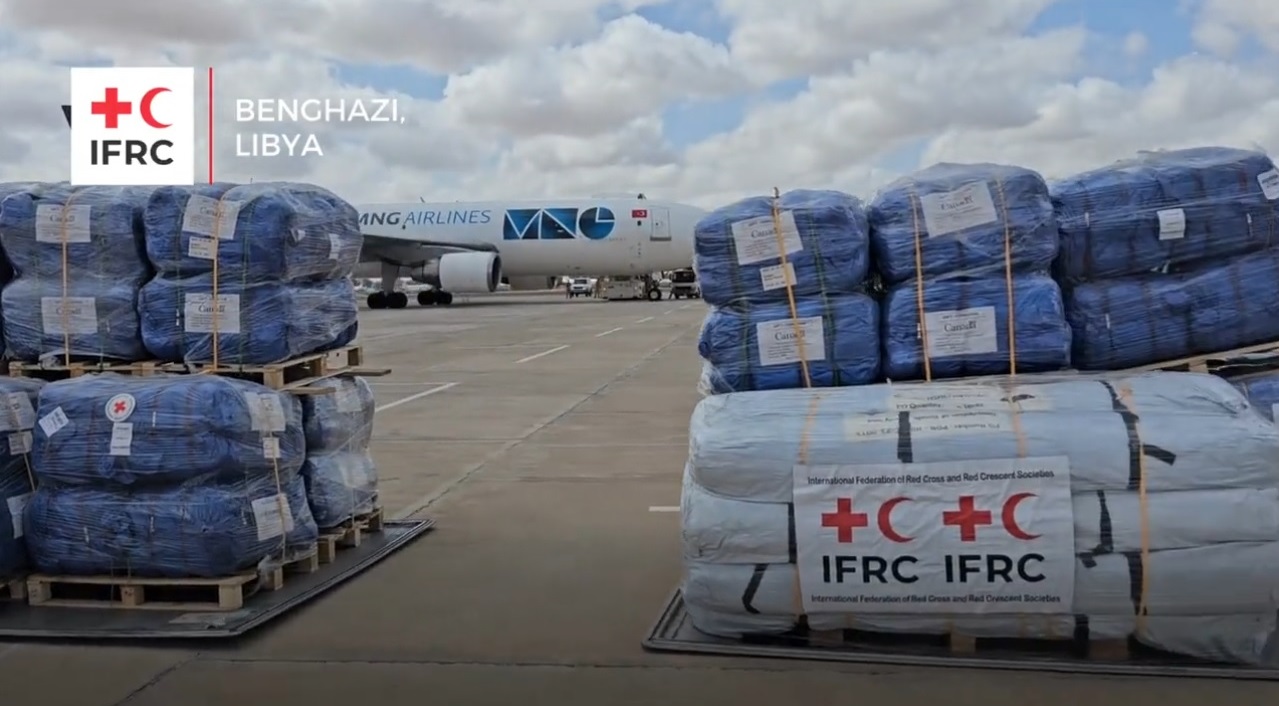 »25.09.2023-Libye: Pomoc obětem katastrofálních záplav v Derně pokračuje. Dnes například přistálo letadlo se 40 tunami humanitárního materiálu - přikrývky, stany, kuchyňské potřeby, pytle na mrtvé, hygienické potřeby a pod., který MF ČK&ČP předává Libyjskému ČP.